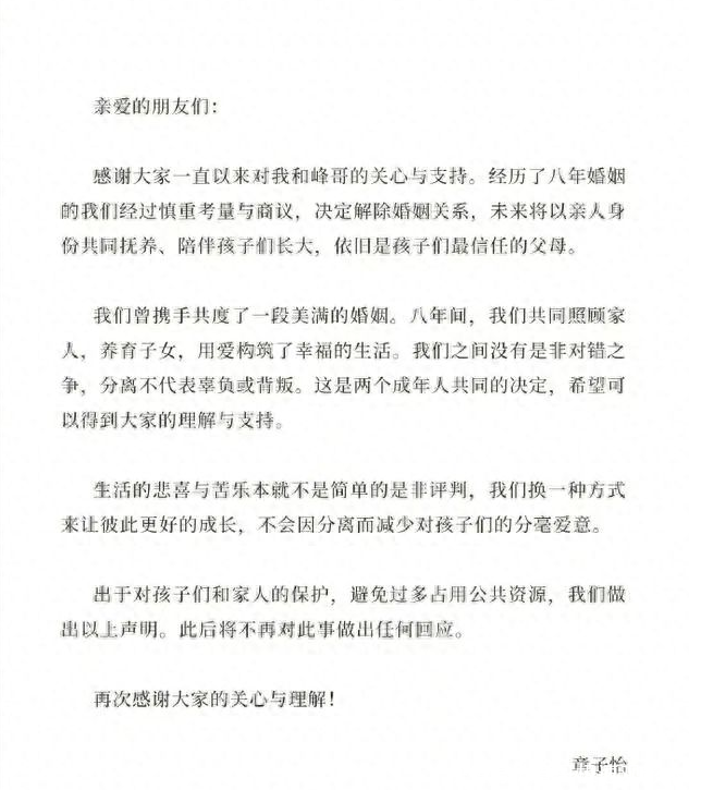在区分声明中,两东说念主如故用“子怡”和“峰哥”称号对方,