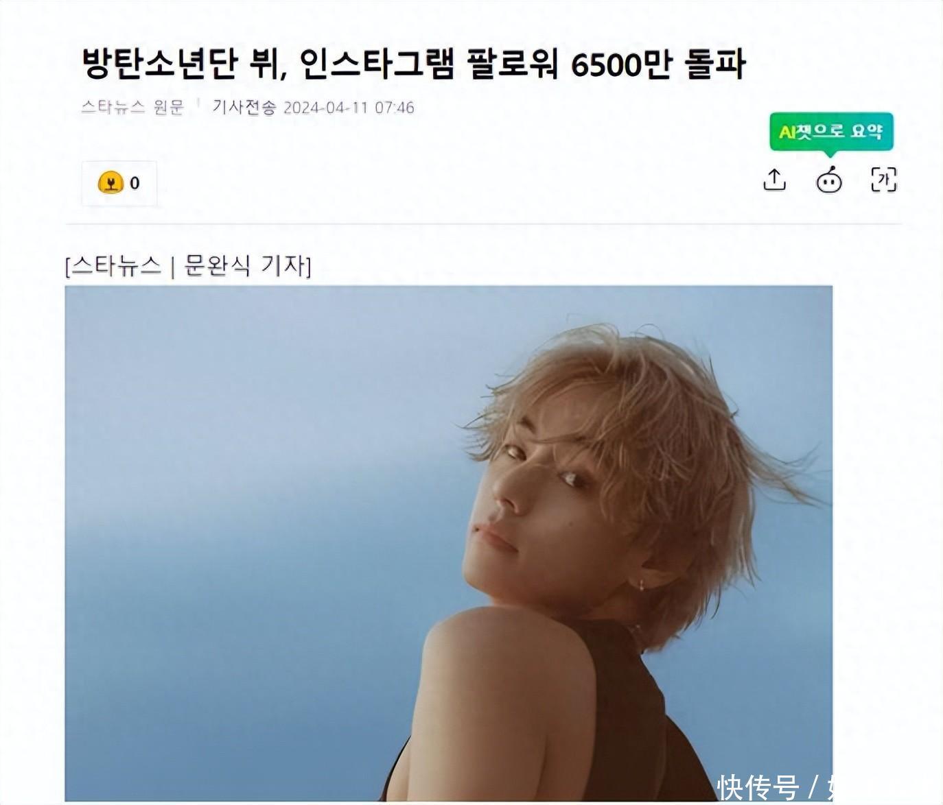 4月11日,有韩国媒体报谈,韩国着名男星,防弹少年团BTS成员金泰亨V在 Instagram 上的粉丝数冲突了6500万,刷新了最快达到6500万的记载,展现了他手脚“外交王”的存在。